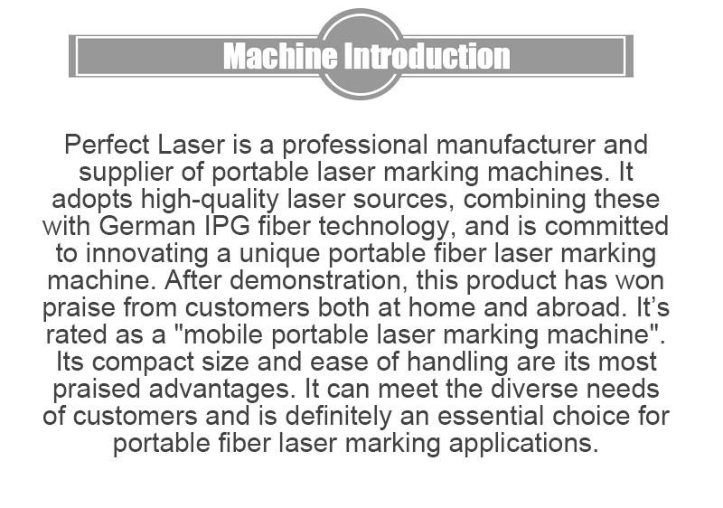 Perfect Laser is a professional manufacturer and supplier of portable laser marking machines. It adopts high-quality laser sources, combining these with German IPG fiber technology, and is committed to innovating a unique portable fiber laser marking machine. After demonstration, this product has won praise from customers both at home and abroad. It’s rated as a "mobile portable laser marking machine". Its compact size and ease of handling are its most praised advantages. It can meet the diverse needs of customers and is definitely an essential choice for portable fiber laser marking applications.