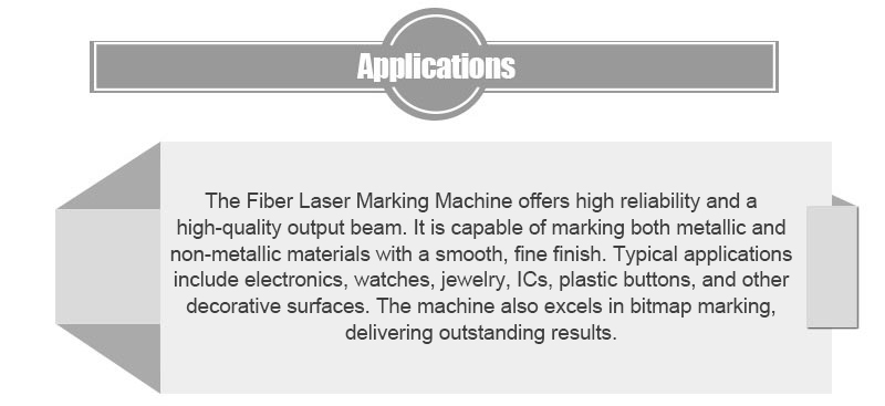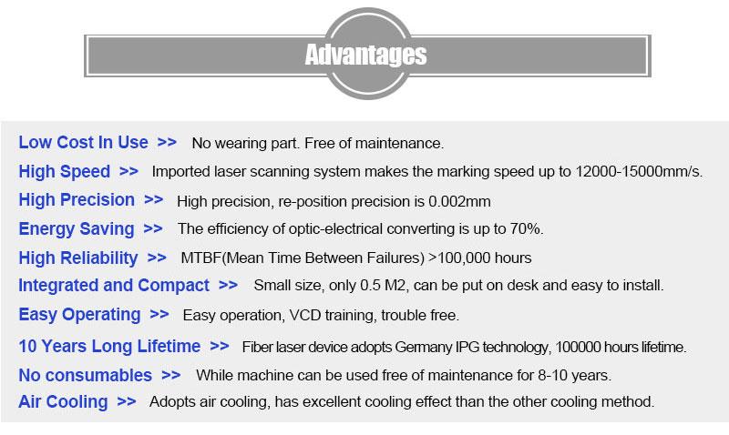This portable fiber laser marking machine is widely used in Electronics and communication tools , IC chips, computer accessories and electrical appliances, all kinds of precise conponents, hardware tools, instrument and meter, aerospace devices, jewelry, clocks, gifts, office supplies, trademark signs, sanitary ware, table ware, food, beverages , tobacco and alcohol and many other industries for marking logos, symbols, words, and the portable fiber laser marker also can be used in production line for mass quantities work.