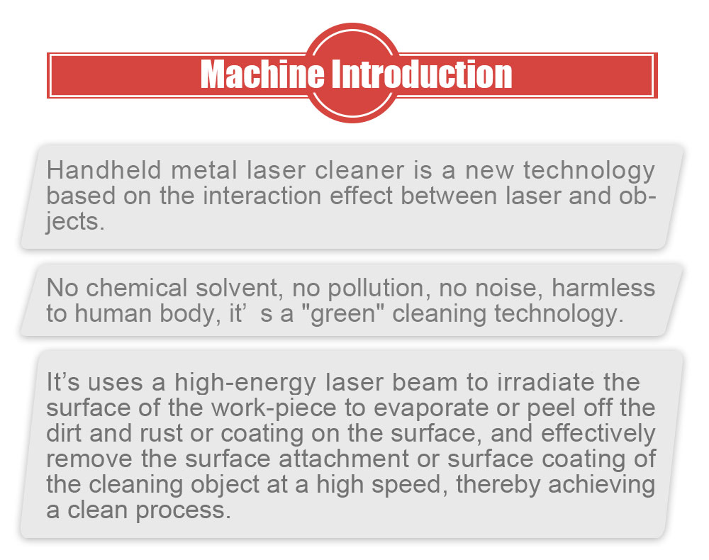 The handheld metal laser cleaning machine has fast cleaning speed, fool-like operation, quick start and easy operation.