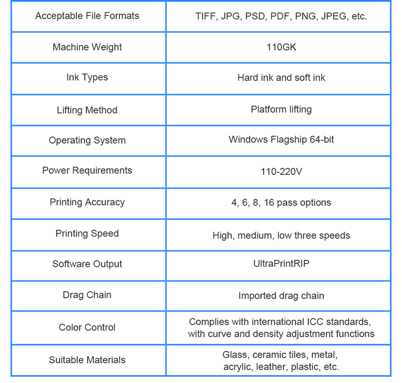 2. Wide material compatibility: Supports printing on various materials including glass, ceramic tiles, metal, acrylic, and leather to meet diverse industry needs.