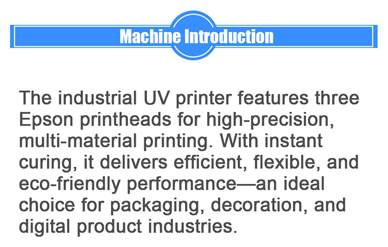 The triple-head industrial UV printer is a high-performance, multi functional device designed to meet the needs of large-scale industrial production.