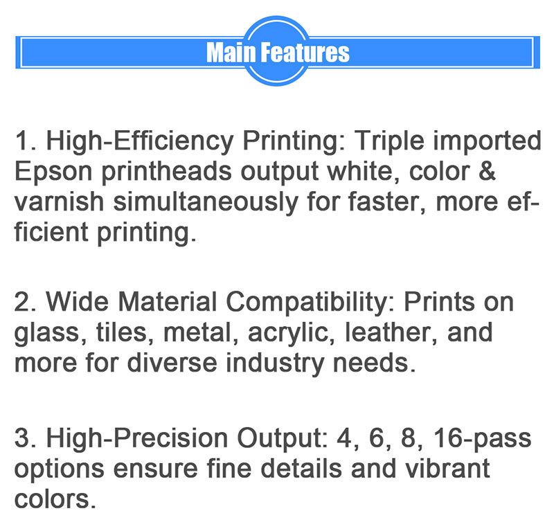 1. High-efficiency printing: The UV flatbed printer uses three imported Epson printheads working simultaneously, enabling synchronized output of white, color, and varnish layers to greatly boost printing speed and efficiency.