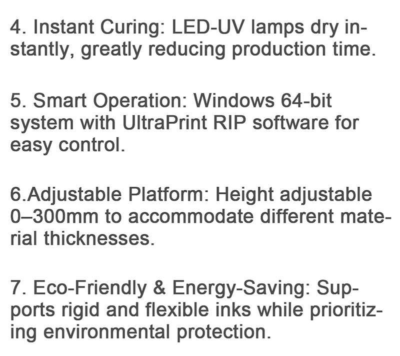 4. Instant curing: Equipped with LED-UV curing lamps for instant drying, significantly shortening production cycles.